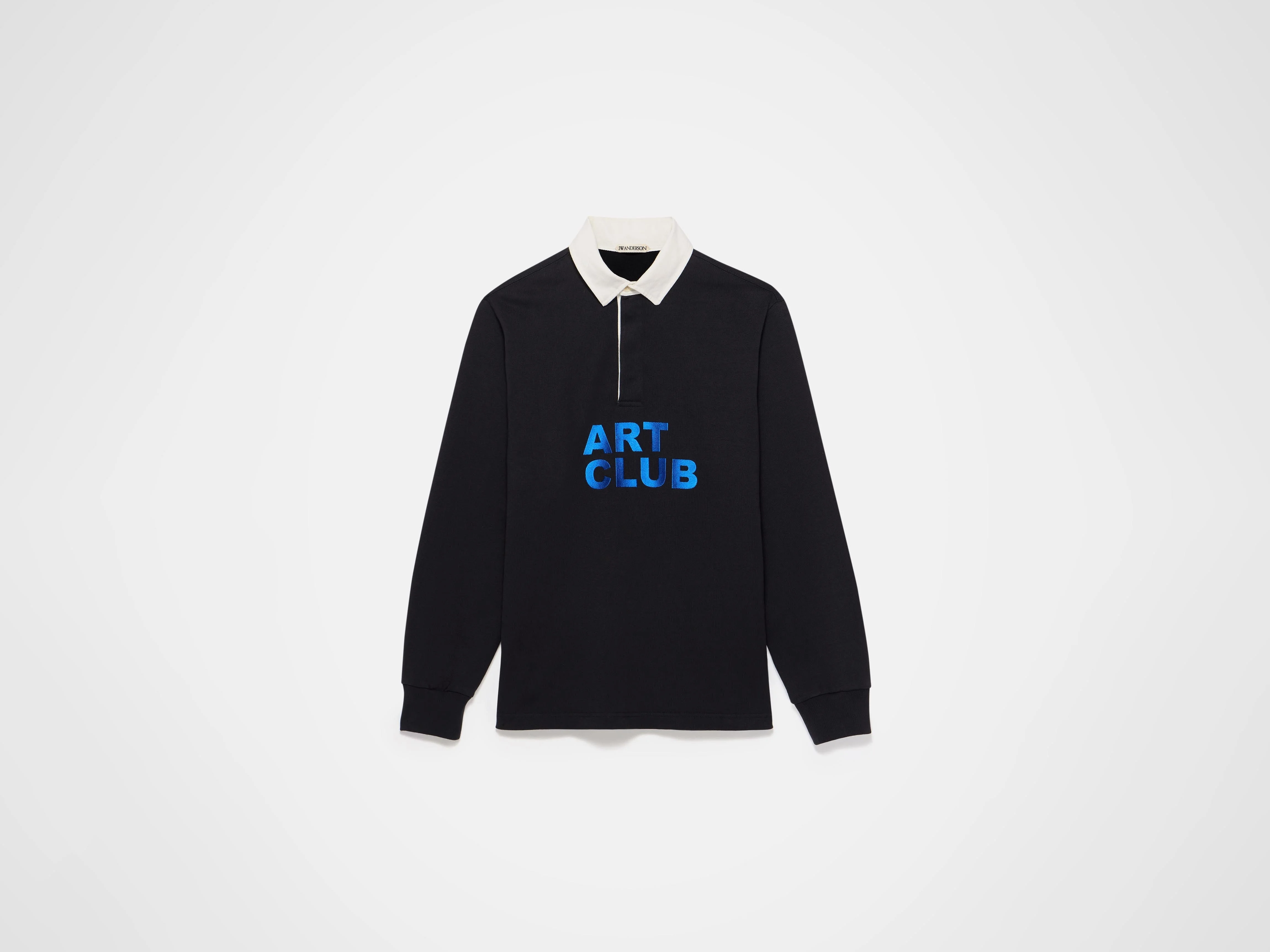 'Art Club' rugby polo top in washed black jersey. Features a graphic satin stitch embroidery, a cotton twill collar and concealed placket. Finished with rib cuffs, side split at the hem and corozo buttons. Details - Colour: Washed Black - Composition [Main]: 100% Cotton - Made in: Portugal - Model [Wears]: Size M, 180cm Tall - SKU: JO0295PG1938781