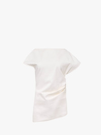 - Asymmetric Draped top with off shoulder design - Draped construction - Asymmetric hem - Tonal lace insert at the back - Side zip closure - Fits true to size, take your normal size Details - Colour: Ivory - Composition: 100% Cotton - Cotton Twill Fabrication - Made in: Poland - SKU: TP0357PG1762006