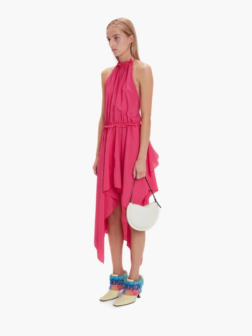 - Halterneck - Gathered neckline - Laid on gathered elasticated waist - Asymmetric hem - Open back with spaghetti strap - Contrast topstitching - Unlined Details - Colour: Fuchsia - Composition: 80% Viscose, 20% Polyamide - Compact, washed hand - Textured finish - Lightweight - Fabric from Italy