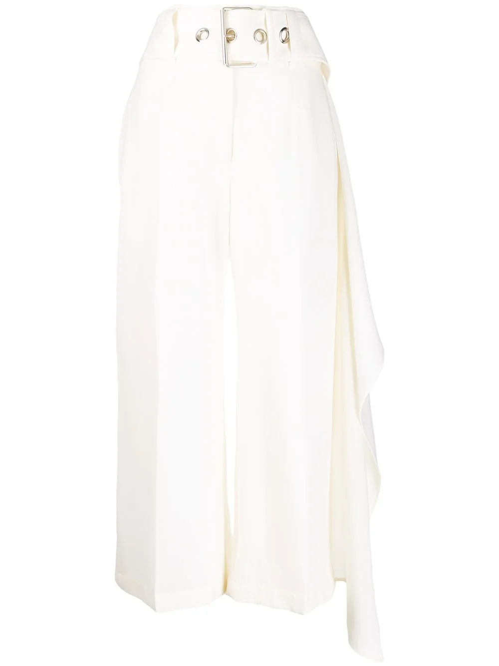 belted cropped trousers Skinny is out and wide is in as per JW Anderson. Crafted in wool, these off-white wide-leg cropped trousers are secured with a belted waist. Belt-up. Featuring a concealed front fastening, a ruffled design and a wide leg. Made in Italy Composition Lining: Viscose 100% Outer: Wool 100% SIZE & FIT Model measurements Height 5 ft 10 in(1.78 m) Bust/Chest 33.07 in(84 cm) Hips 35.82 in(91 cm) Waist 25.98 in(66 cm) FittingInformation This piece fits true to size. We recommend you get your regular size Designed to be fitted at the waist, loose over the leg Made with a mid-weight non-stretch fabric Washing instructions Dry Clean Only