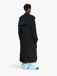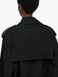 - Relaxed fit trench coat complete with belt fastening - Self belt with silver buckle and eyelets - Black buttons - Belted cuffs - Side pockets - Black metal logo plaque at centre back - Unlined Details - Colour: Black - Composition: 100% Nylon - Twill construction - Natural shine - Rounded drape - Made in: Japan - SKU: CO0344PG1818999