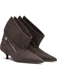 Ankle-high suede boots. · Pointed toe · Zip detailing at outer side · Zip closure at heel · Buffed leather lining · Covered kitten heel with rubber injection · Leather sole · Heel: H1.5" Supplier color: Deep walnut Upper: leather. Sole: leather, rubber. Made in Italy 252477F122001