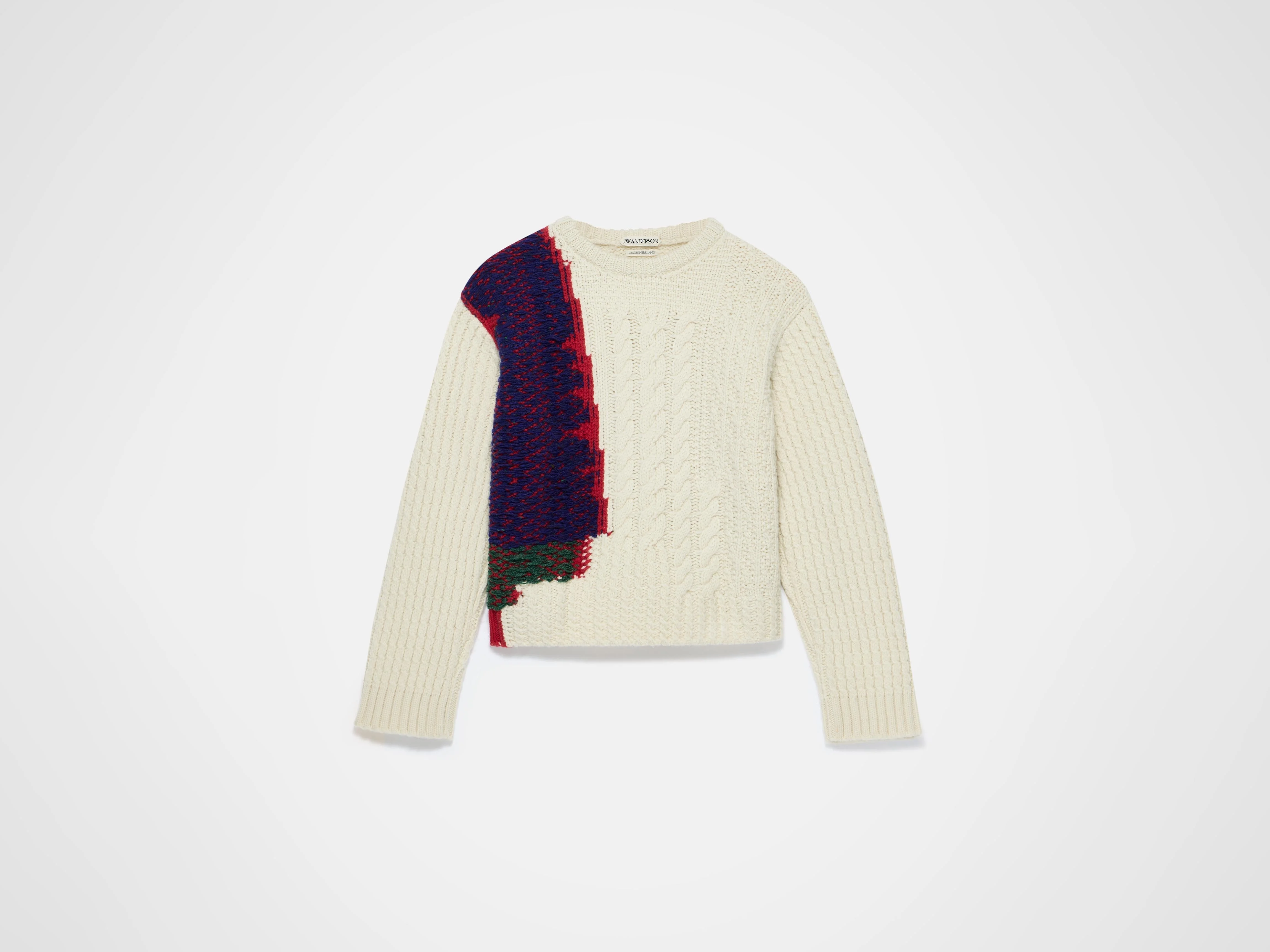 Cable-knit jumper in chunky ivory knit. Features a distorted float jacquard and jacquard elbow patch. Finished with rib trims. Crafted in Ireland. Details - Colour: Ivory - Composition [Main]: 100% Wool - Made in: Ireland - Model [Wears]: Size S, 178cm Tall - SKU: KW1482YN0461006