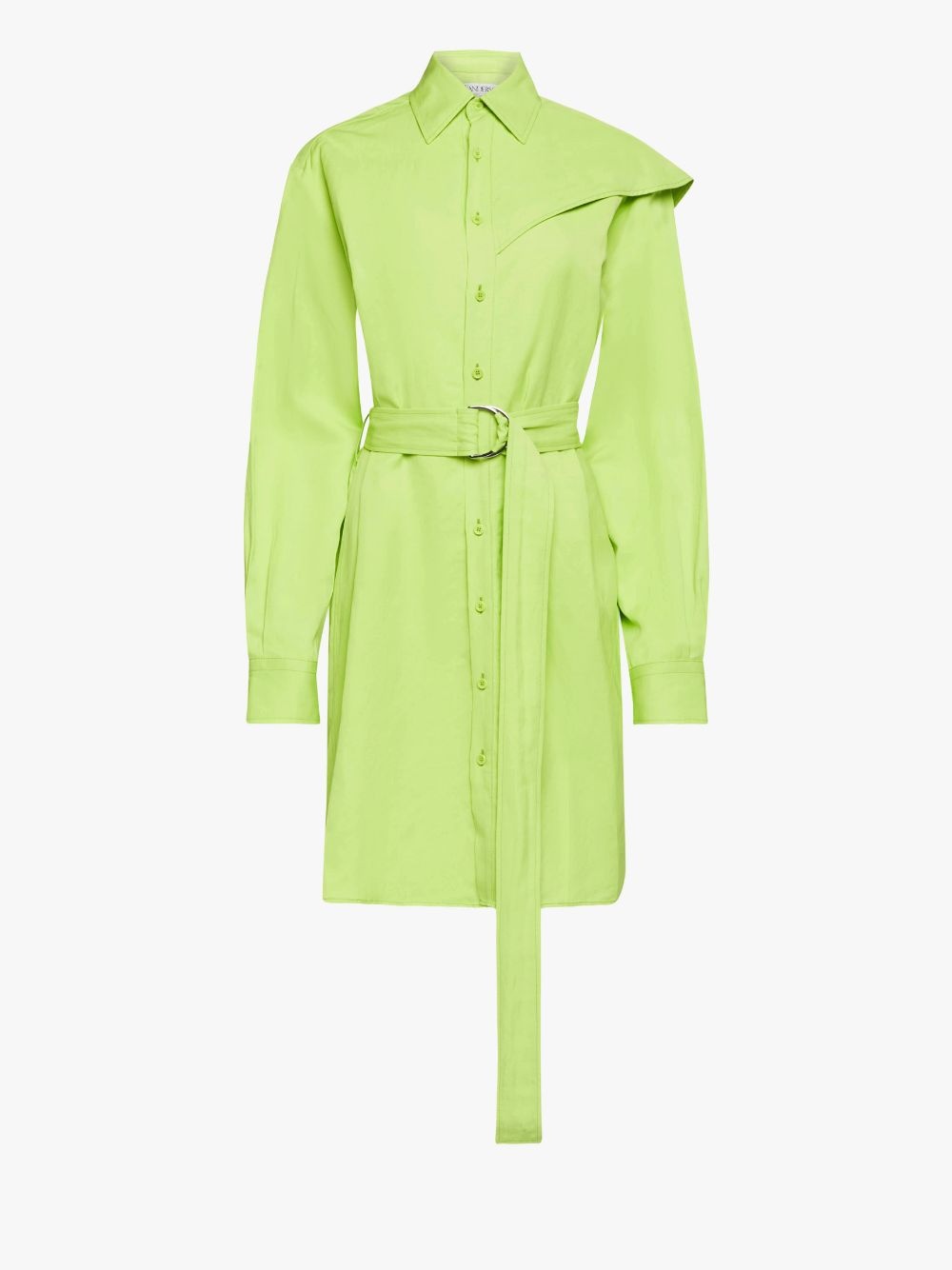 - Draped shirt dress, complete with cape shoulder design - D ring self belt - Mother-of-pearl buttons - Tonal anchor embroidery on centre back - Relaxed fit, take your usual size Additional Information - Colour: Lime - Composition: 77% Viscose, 23% Linen - Light-weight linen blend fabrication - Made in: Portugal - SKU: DR0474PG1690526