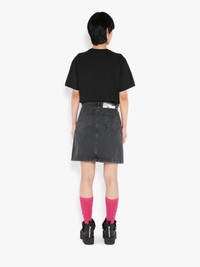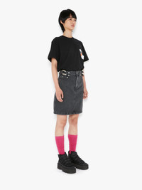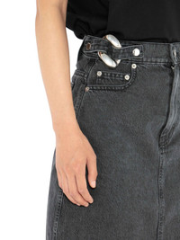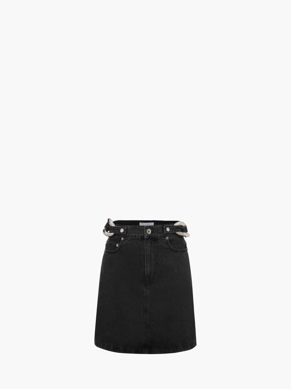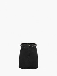 - Mid waist mini demin skirt - Straight fit - Above knee length - Detachable chain link on waist - Contrast tobacco top stitching - Anchor profile stitch on back pocket - Logo embossed silver leather patch - Silver hardware - Fits true to size, take your normal size. Details - Colour: Black - Composition: 100% Cotton - Mid wash - Rigid denim - Fabric from Italy