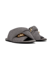 Calfskin suede slip-on sandals in gray. Trompe l'œil faux-denim effect printed throughout. · Open round toe · Criss-crossing padded straps and curb chain hardware at vamp · Grained sheepskin lining · Logo-embossed padded leather footbed · Rubber sole · Gold-tone hardware Supplier color: Dark grey Upper: calfskin. Sole: rubber. Made in Italy 231477F124001