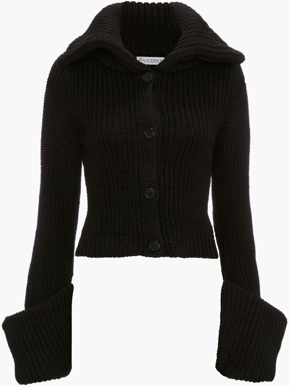 - Chunky knit cardigan - Oversized cuff and collar - Cropped fit with fitted silhouette - Tonal branded buttons - Fits true to size, take your normal size Details - Colour: Black - Composition: 100% Recycled Polyester - Made in China