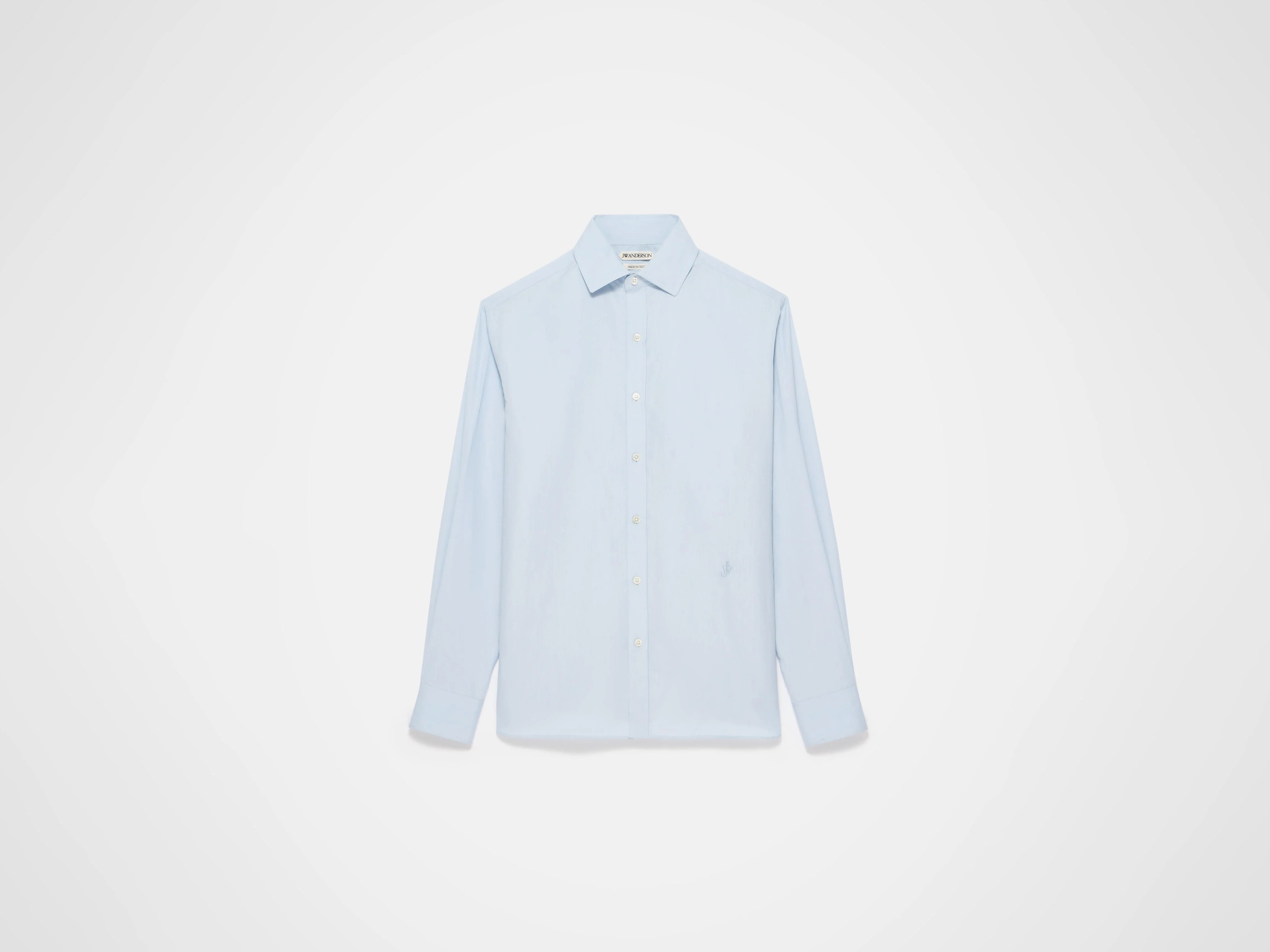 Unisex powder blue shirt in a masculine silhouette. Crafted in sea island cotton and features mother of pearl buttons, finished with anchor embroidery in tonal thread. Details - Colour: Powder Blue - Composition [Main]: 89% Cotton, 11% Silk - Made in: Italy - Model [Wears]: Size 8, 180cm Tall - SKU: SH0388PG1894805