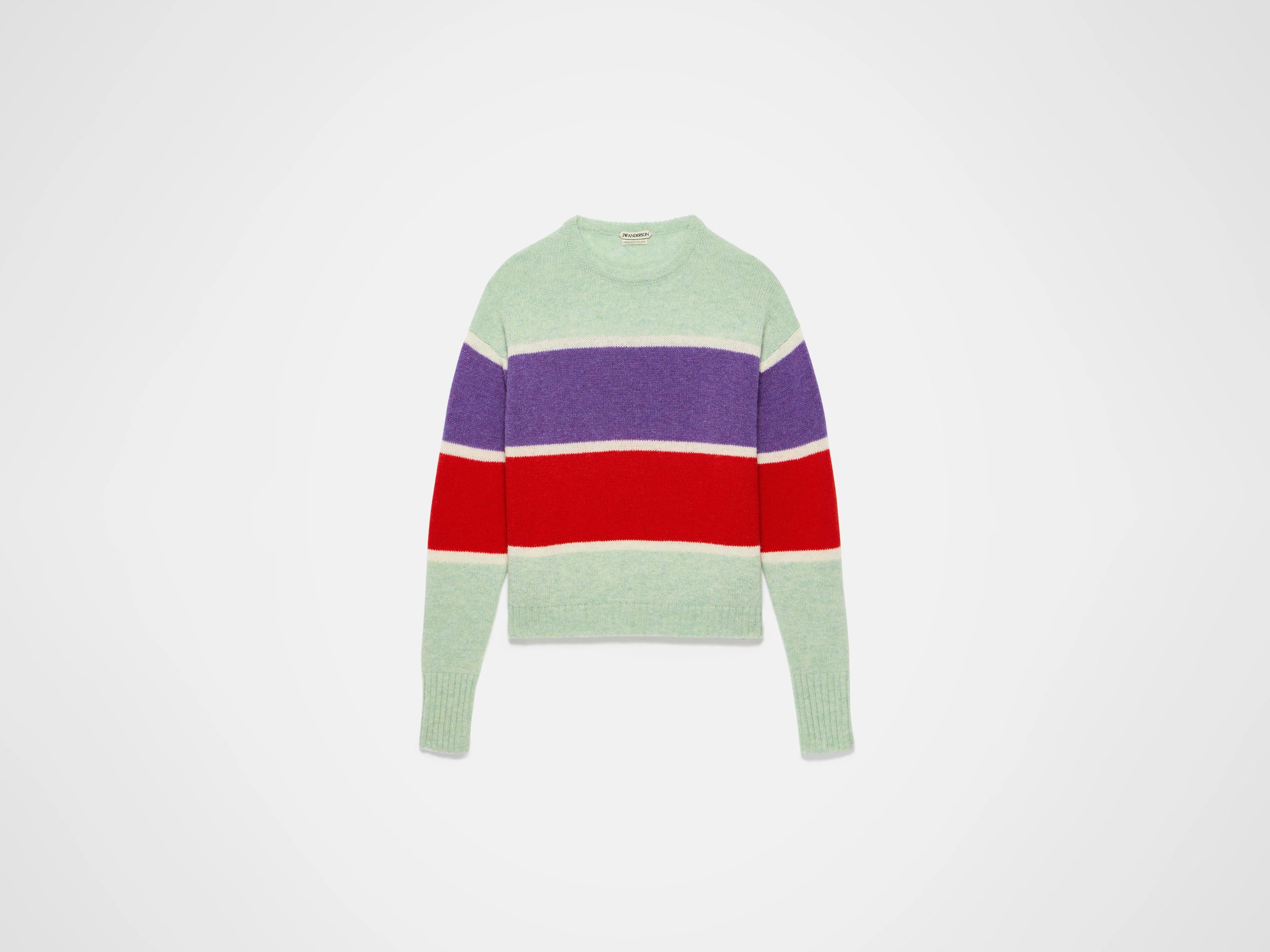 Contrast striped crew neck jumper in mint. Features a placement stripe and rib trim, finished with a side seam split at the hem. Made in Scotland. Details - Colour: Mint - Composition [Main]: 100% Lambswool - Made in: United Kingdom - Model [Wears]: Size L, 180cm Tall - SKU: KW1522YN0449515