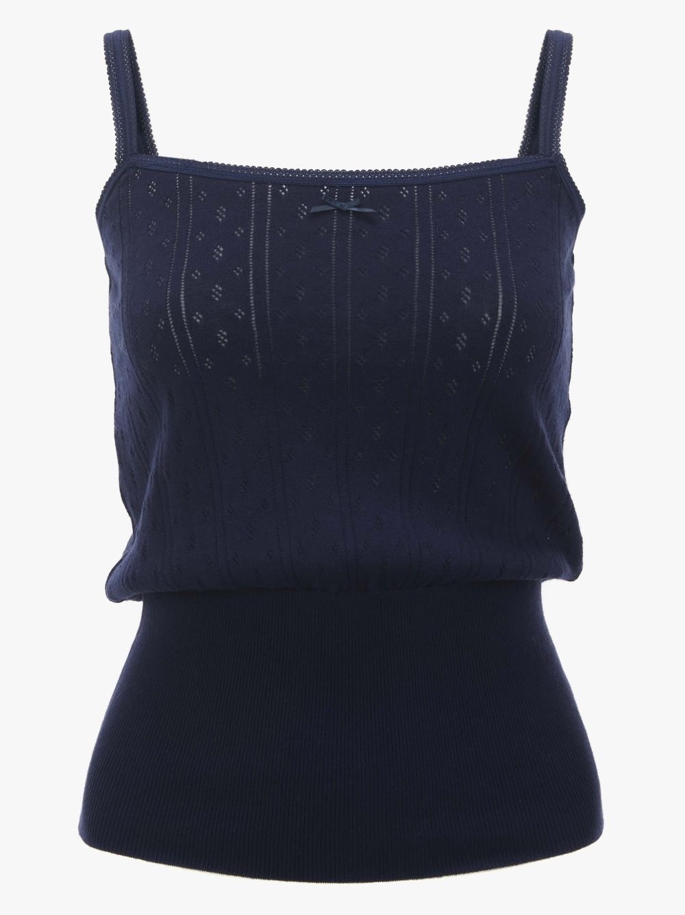 - Knitted vest top complete with finished edging - Pointelle Stitching, and deep ribbed hemline - Contrasting coloured branded Anchor embroidery - Small bow detailing - Fitted silhouette, take your regular size Details - Colour: Navy - Composition - Main: 95% Cotton, 5% Cashmere - Lightweight pointelle knit fabrication - Cashmere blend - Made in China - SKU: KW1274YN0389888