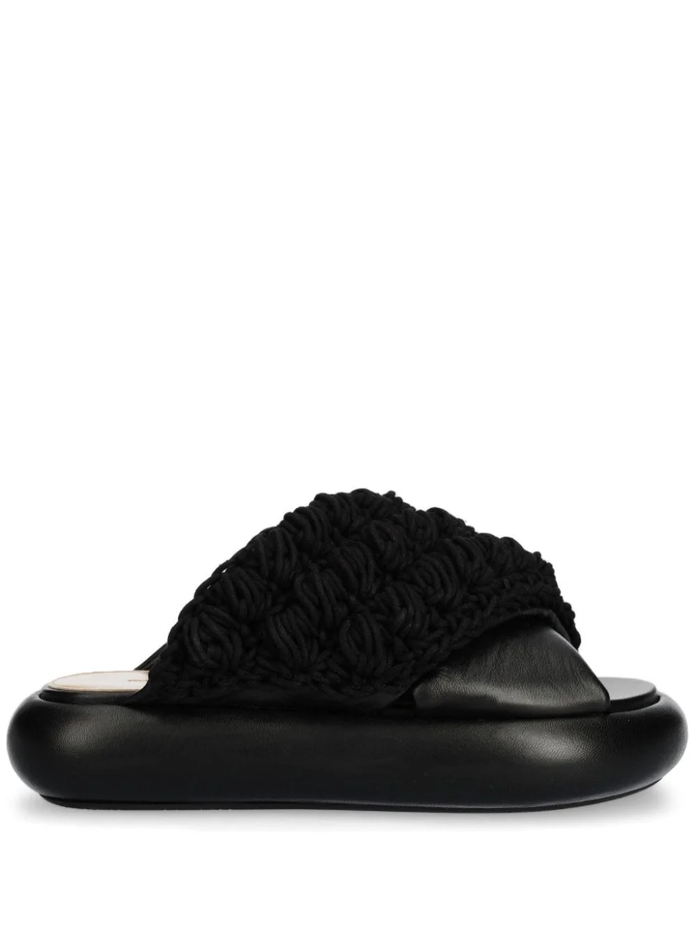 Crochet Twister slides Highlights - Black - Calf leather - Crochet panelling - Crossover strap detail - Open toe - Flatform sole Imported Composition Leather 100%