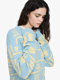 - Relaxed fit jacquard jumper with abstract crockery knit design - Dropped shoulder - Ribbed cuffs, neck and hem - Intarsia stitch Details - Colour: Light Blue/Buttermilk - Composition: 100% Lambswool - Mid weight - Made in: China - SKU: KW1490YN0379281