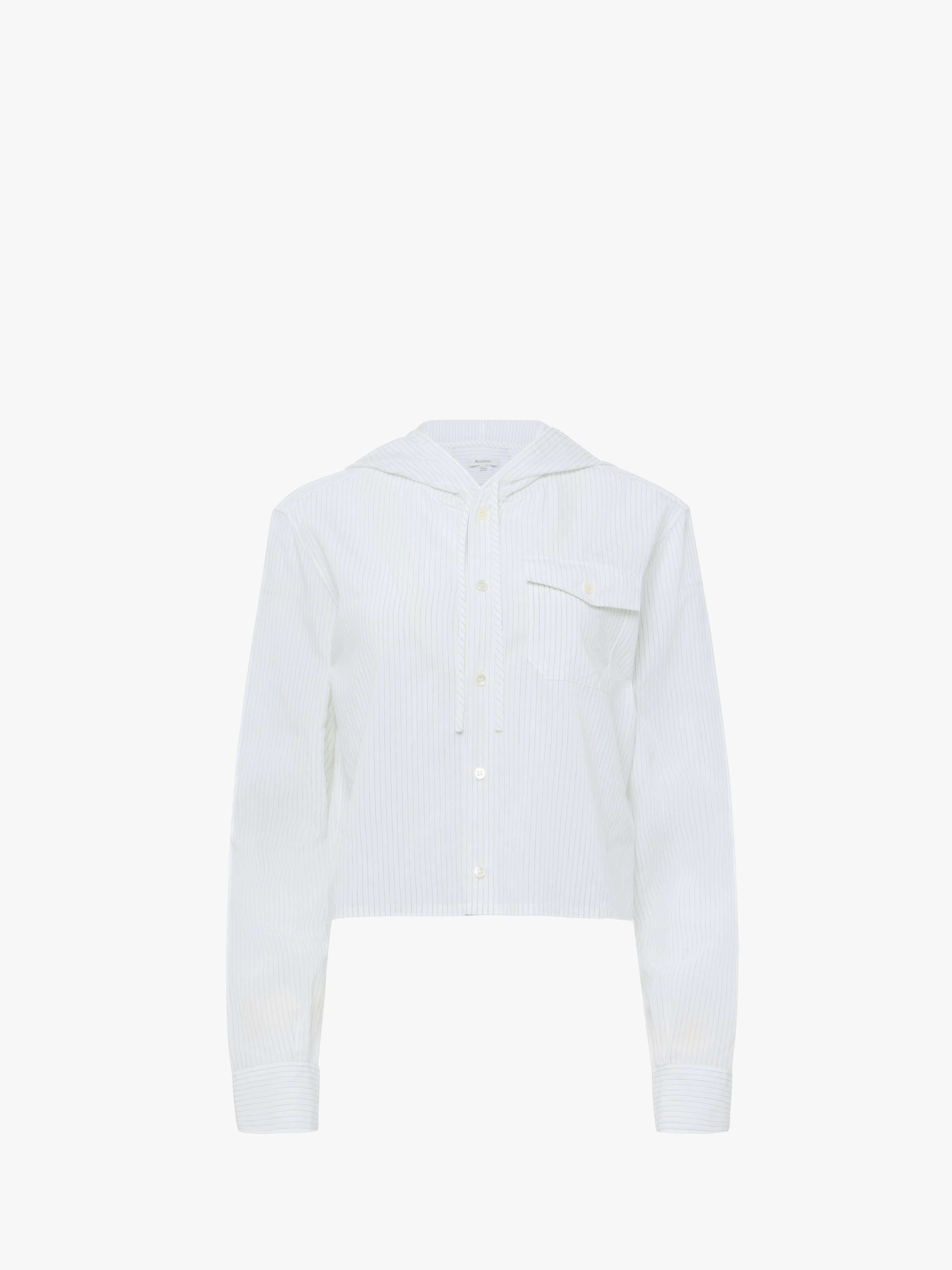 - Hooded cropped shirt complete with self covered cord details - Tonal buttoned chest pocket - Long sleeves complete with buttoned cuffs - Unlined Details - Colour: Off White/Grey - Composition: 100% Cotton - Textured pinstripe fabrication - Sleeve length: 89cm - Centre back length: 51.5cm - Made in: Italy - SKU: SH0375PG1822040