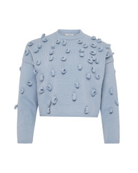 The Cropped Loop Jumper in Powder Blue by JW Anderson is a cropped boxy fit jumper with dropped shoulder detail featuring irregular loop detailing, and ribbed cuffs, neck and hem. - Silver metal logo plaque at centre back - Unlined - 73% Cotton, 27% Polyamide - Sleeve length: 75cm - Centre back length: 45cm - Made in China - KW1446YN0417445 - Model Wearing Size: S