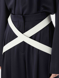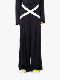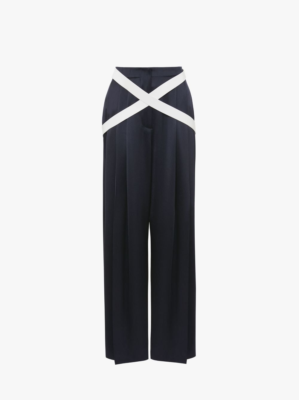 - Wide leg trousers - Pleat front - Detachable crossover satin detail on front - Centre front and back crease - Single back welt pocket - Unlined - Fits true to size, take your normal size.