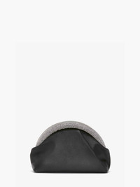 - Leather clutch bag with top magnetic opening - Oversized tubular design detail with crystal embellishment - Silver logo embossing on front outer panel - Inner slip pocket with blind logo embossing - Nylon lining