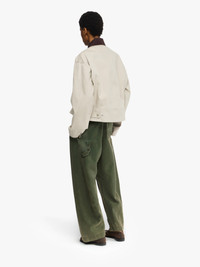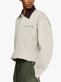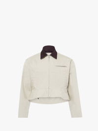 - Relaxed fit dropped shoulder workwear jacket complete with zip closure - Under collar in reverse side of fabric - Curved hem - Internal pocket with snap closure - Zipped chest pocket - Side pockets - Snap closure on cuffs and side tabs - Contrast bonding - Unlined Details - Colour: Nougat/Chocolate - Composition: 100% Cotton - Sleeve length: 89cm - Centre back length: 64cm - Bonded construction - Classic trench fabric - Made in: Italy - SKU: JK0413PG1802166