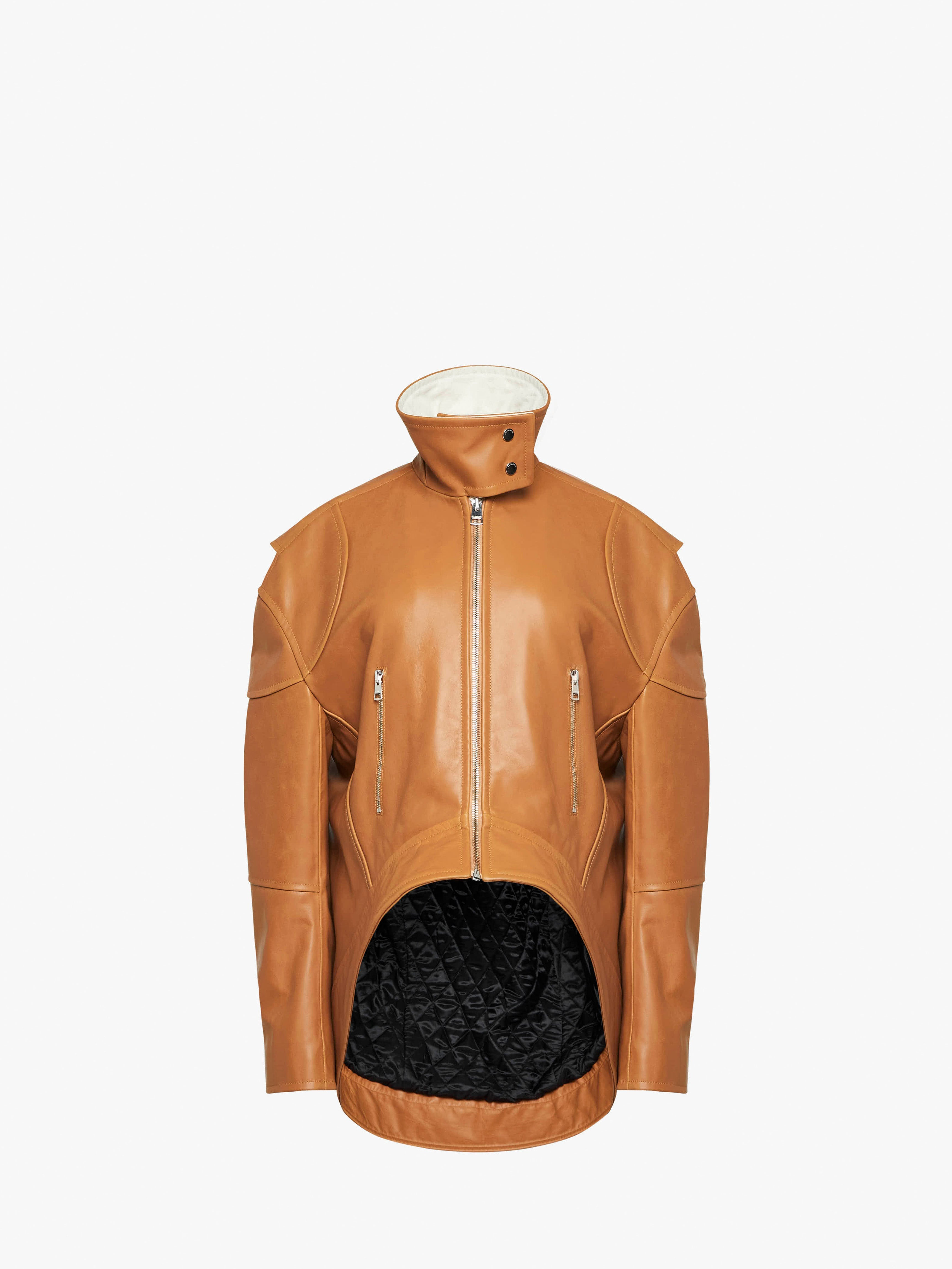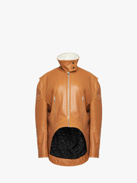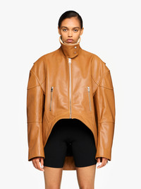- Featured on the Runway - Zip-front leather jacket, complete with curved asymmetric hemline - High collar with canvas detail and double snaps - Silver hardware - Quilted lining - Oversized fit, take your usual size Additional Information - Colour: Tan - Composition: 100% Leather - Mid-weight smooth leather fabrication - Made in: United Kingdom - SKU: LJ0046LT0117640