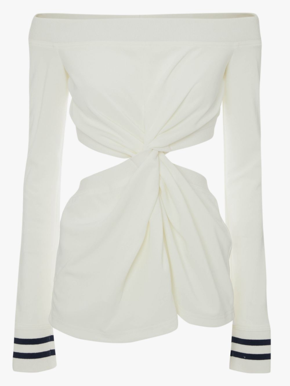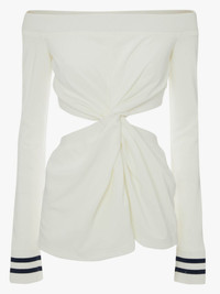 - Off the shoulder top - Fitted silhouette - Twisted open waist - Ribbed details - Fits true to size, take your normal size. Details - Colour: Off White - Composition: 100% Polyester - Slight grainy surface appearance - Fluid drape - Fabric from Japan