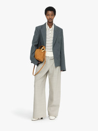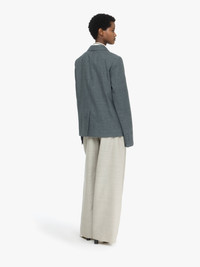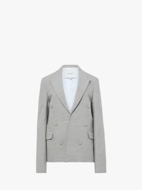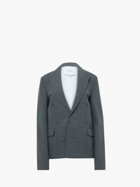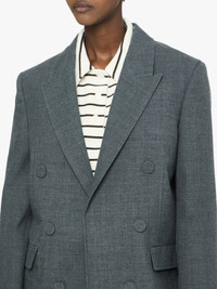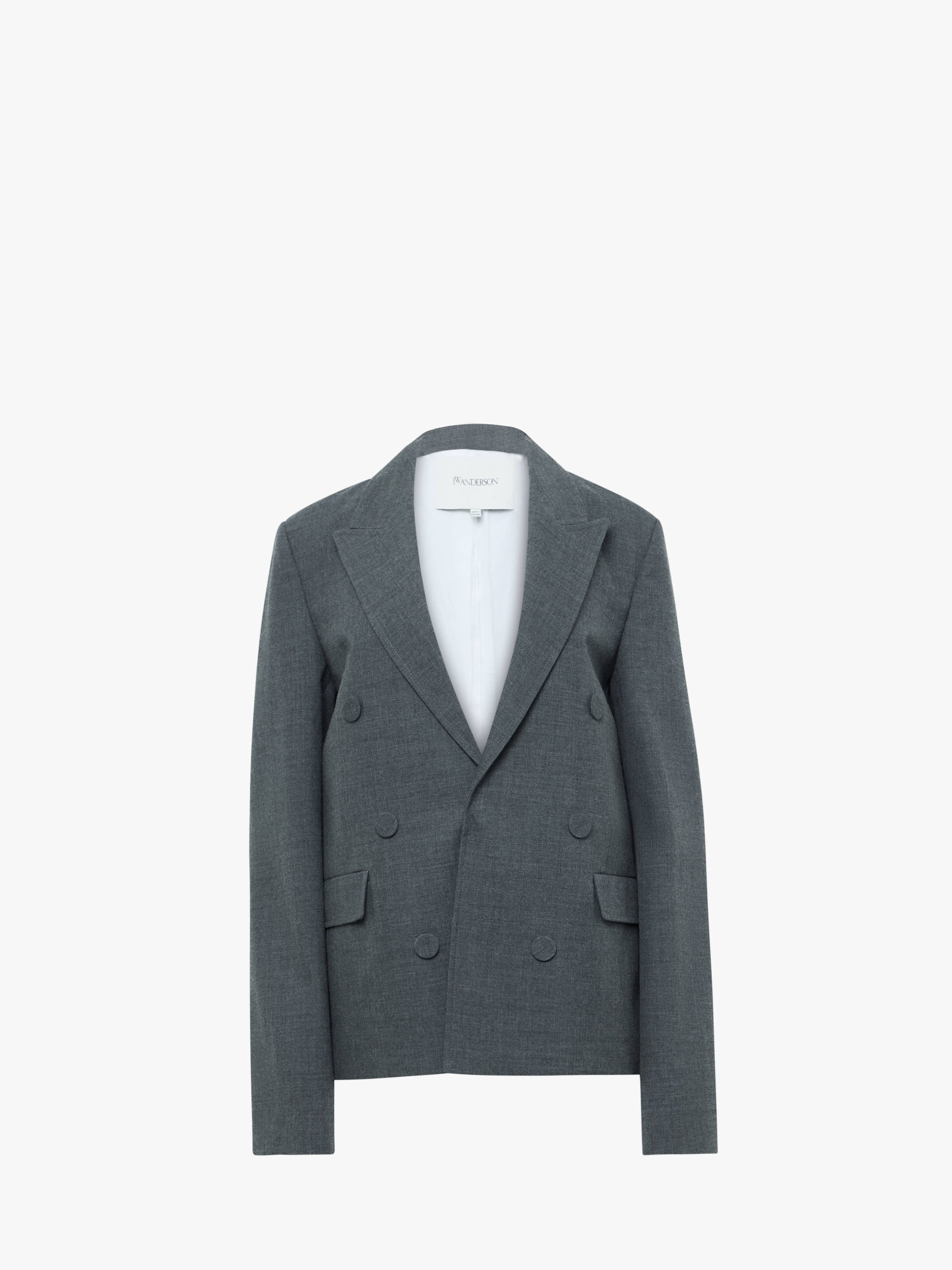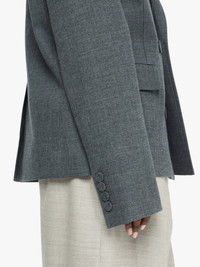 - Oversized double-breasted tailored jacket - Front patch pockets - Self covered decorative buttons on front - Snap closure - Internal pocket - Buttoned cuffs - Open slit at centre back - Contrast lining Details - Colour: Charcoal Melange - Composition: 100% Wool - Twill construction - Sleeve length: 93cm - Centre back length: 69cm - Made in: Romania - SKU: JK0401PG1821972