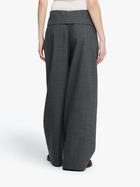 - Tailored trouser complete with asymmetric fold over waistband - Knot button at front - Wide leg - High rise - Side pockets - Unlined Details - Colour: Charcoal Melange - Composition: 100% Wool - Twill Construction - Made in: Romania - SKU: TR0414PG1821972