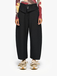 - Curved wide-leg trouser complete with fold over waistband - Metal J detail with silver hardware - High waisted - Side pockets - Relaxed fit, take your usual size Additional Information - Colour: Black - Composition: 99% Viscose, 1% Silk - Light-weight silk-blend fabrication - Made in: Romania - SKU: TR0394PG1684999