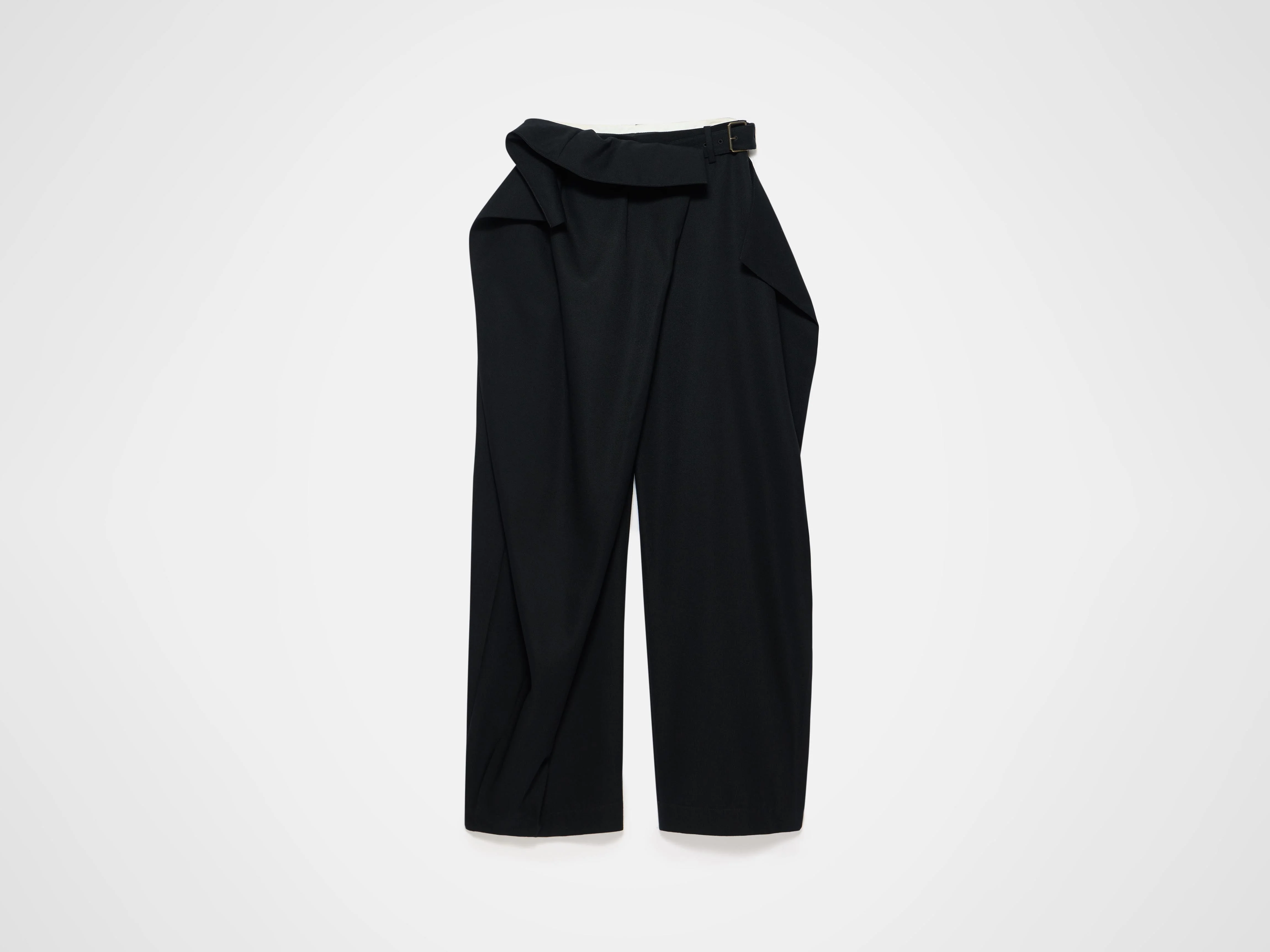 A fresh take on the classic JW Anderson fold over trouser. Finished with an antique brass buckle and embroidered eyelets. Details - Colour: Black - Composition [Main]: 100% Wool - Composition [Lining]: 100% Cupro - Made in: Italy - Model [Wears]: Size 8, 180cm Tall - SKU: TR0425PG1883999