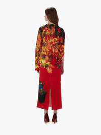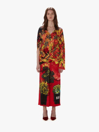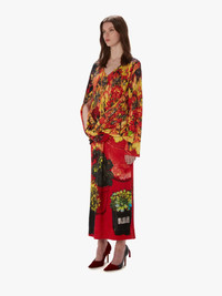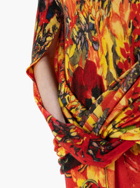 - Long-line asymmetric dress with drape front detailling, and all over abstract print - V-neckline - Relaxed silhouette - Asymmetric sleeves and draped front panel - Ribbed hemline and cuffs - Centre back slit - Regular fit - take your usual size Additional Information - Colour: Red - Composition - Main: 90% Wool, 10% Cashmere - Made in China
