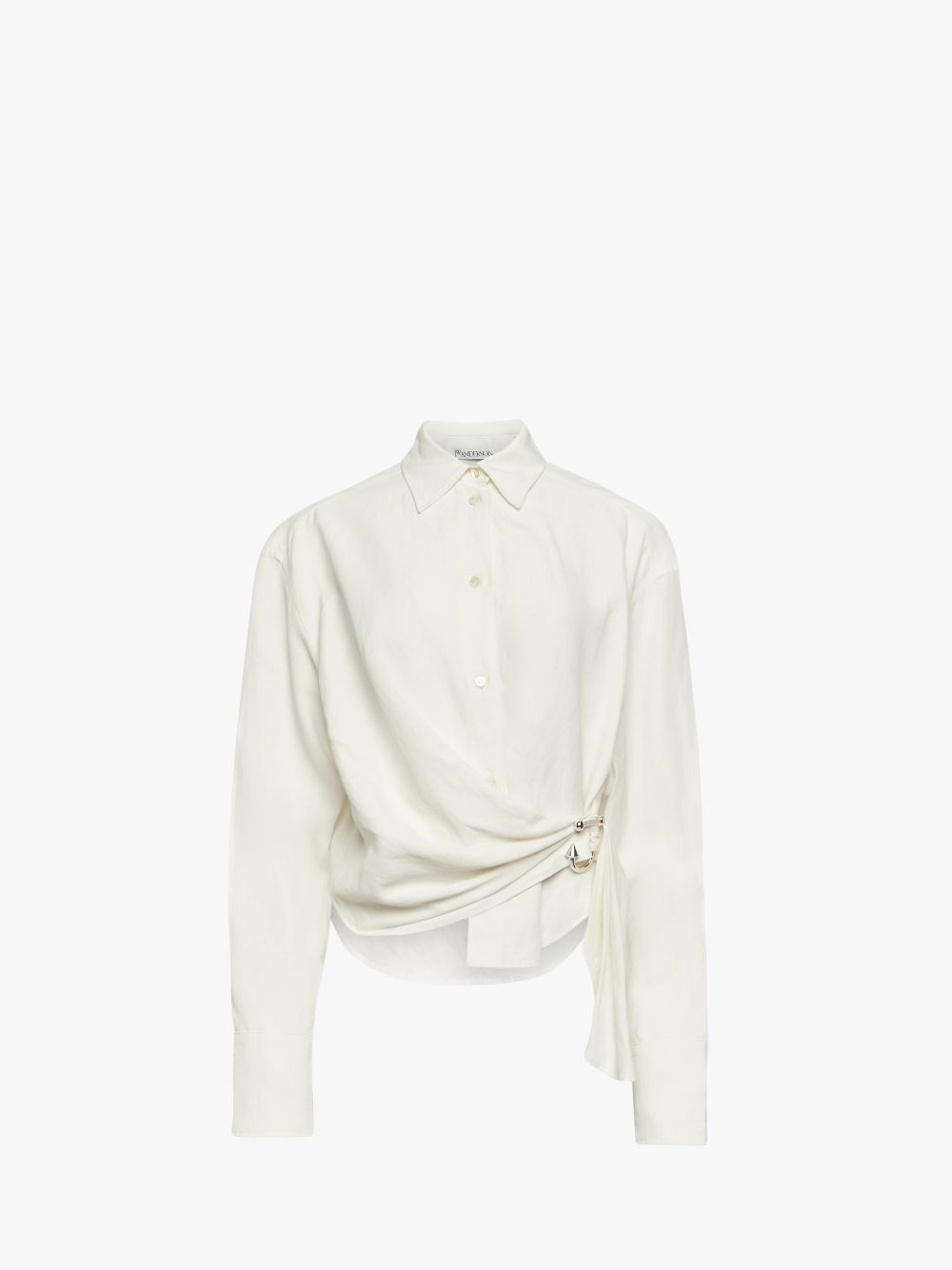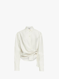 - Long sleeve twisted draped shirt with asymmetric hemline - Dropped shoulder - Metal J detail with silver hardware - Mother-of-pearl buttons - Relaxed fit, take your usual size Additional Information - Colour: Off White - Composition: 77% Viscose, 23% Linen - Light-weight linen blend fabrication - Made in: Poland - SKU: SH0346PG1690002