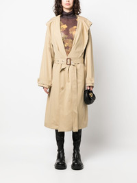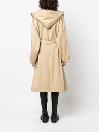 hooded double-breasted trench coat Highlights - Beige - Cotton - Gabardine weave - Drawstring hood - V-neck - Double-breasted button fastening - Long sleeves - Buttoned cuffs - Belted waist - Central rear vent - Flared - Below-knee length Imported Composition Outer: Cotton 100% Lining: Cotton 100%, Polyester 51%, Viscose 49% SIZE & FIT Model measurements Height 5 ft 9 in(1.76 m) Bust/Chest 33.07 in(84 cm) Hips 34.64 in(88 cm) Waist 25.59 in(65 cm) FittingInformation Designed to be unstructured, offering a loose fit throughout The belt offers adjustability for fitted preferences Made from a midweight non-stretch fabric This piece fits true to size – take your usual size Washing instructions Dry Clean Only