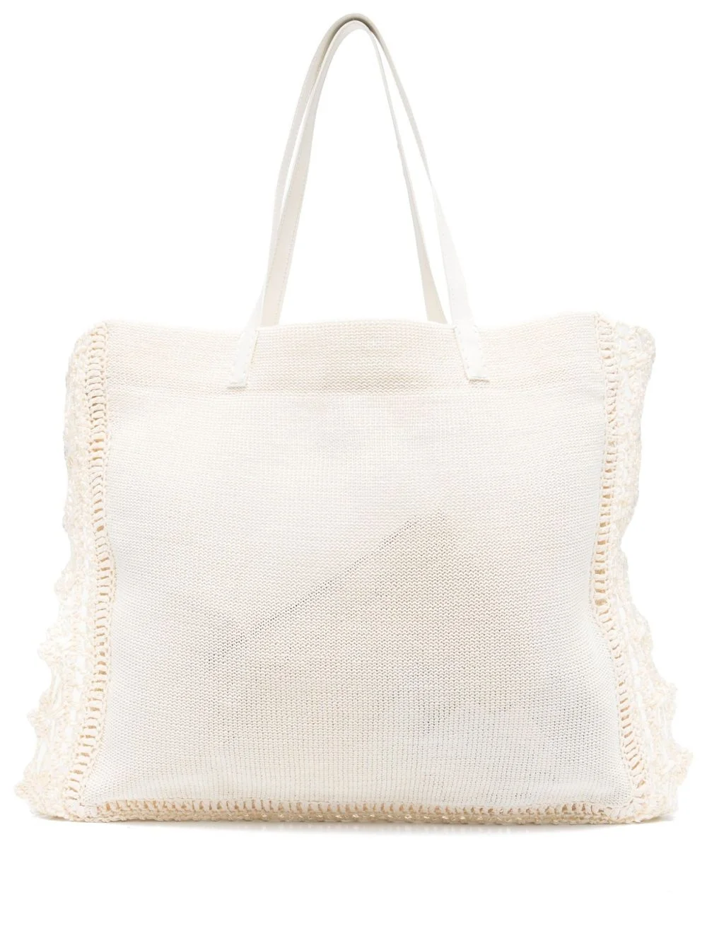 Ivory crochet shopping bag Highlights - Light beige - Open top - Two flat top handles - Removable pouch - This piece comes complete with a protective dust bag. Imported Composition Outer: Suede 100%, Leather 100% SIZE & FIT Model measurements Height 5 ft 11 in(1.8 m) Bust/Chest 32.67 in(83 cm) Hips 35.82 in(91 cm) Waist 25.98 in(66 cm) Measurement HEIGHT 1600.39 in(4065 cm) WIDTH 18.89 in(48 cm)