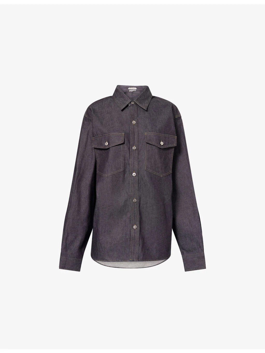 PRODUCT DETAILS - JW Anderson denim shirt - 100% cotton - Button fastening - Oversized boxy fit, classic collar, long sleeves, dropped shoulders, buttoned cuffs, two patch flap pockets at front, curved hem, branded leather patch at back - Dry clean - Made in Japan - True to size - Model is 5ft 10in/1.78m and wears a size small - Midweight, non-stretch Ref: R04569595