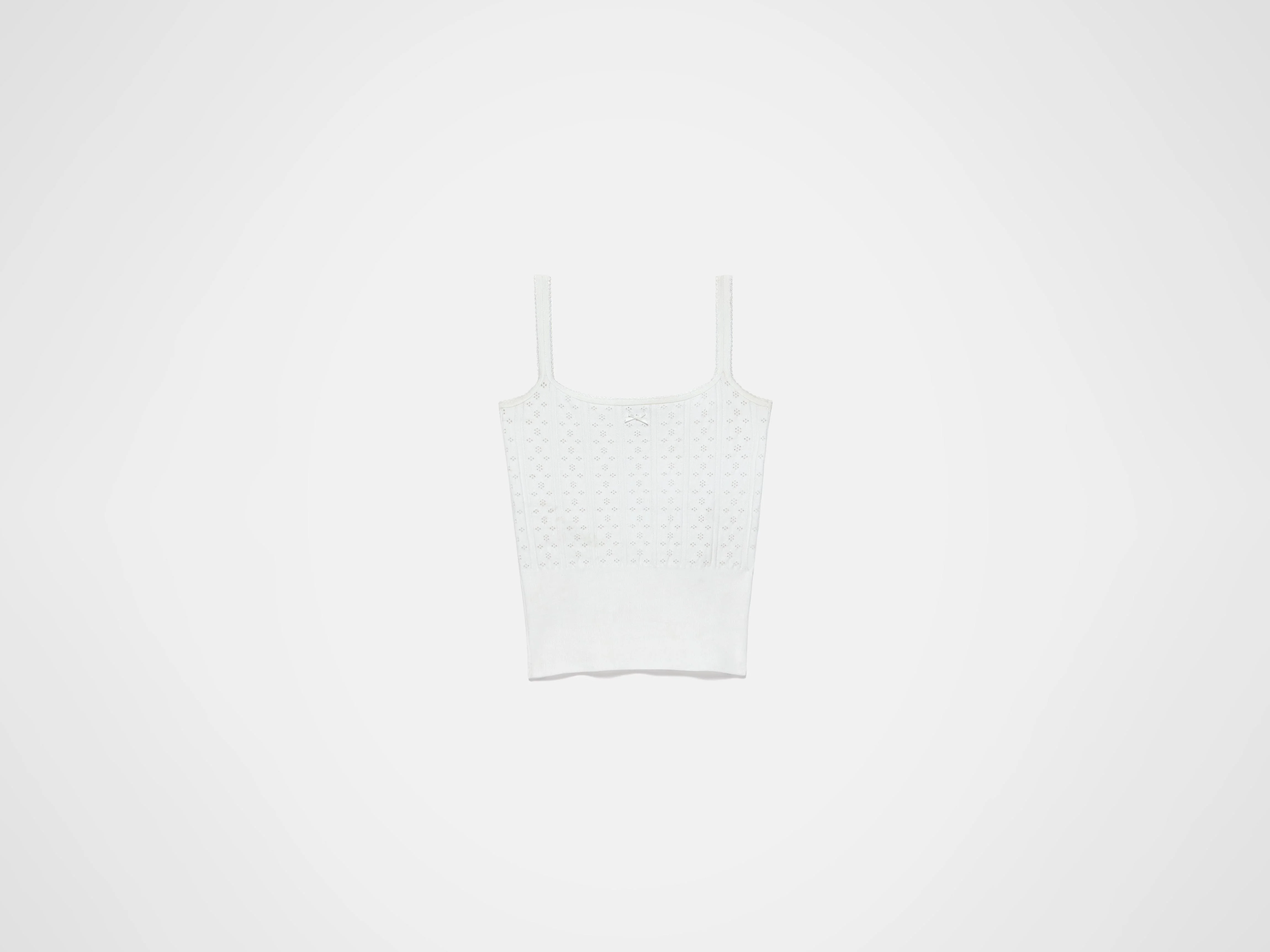 Knitted pointelle cami top in white technical stretch viscose knit. Features a scallop detailing at the neckline and straps, finished with a bow detail. Details - Colour: Off White - Composition [Main]: 66% Viscose, 19% Polyamide, 13% Polyester, 2% Elastane - Made in: China - Model [Wears]: Size S, 178cm Tall - SKU: KW1469YN0309002
