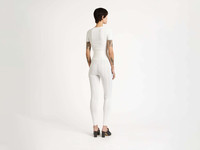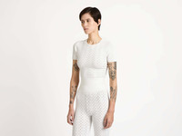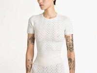 Knitted pointelle crew neck T-shirt in white technical stretch viscose knit. Features a scallop detailing at the neckline, finished with a bow detail. Details - Colour: Off White - Composition [Main]: 66% Viscose, 19% Polyamide, 13% Polyester, 2% Elastane - Made in: China - Model [Wears]: Size S, 180cm Tall - SKU: KW1477YN0309002