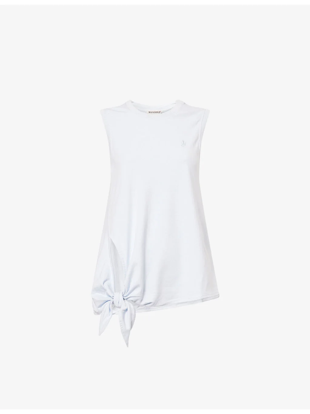 PRODUCT DETAILS - JW Anderson cotton tank top - 100% cotton - Regular fit, round neck, sleeveless, adjustable knot at hem, all-over pinstripe, elasticated trims, embroidered logo at chest - Machine wash at 30°C - Made in Portugal - True to size - Model is 5ft 10in/1.78m and wears a size small - Lightweight, stretchy Ref: R04569588