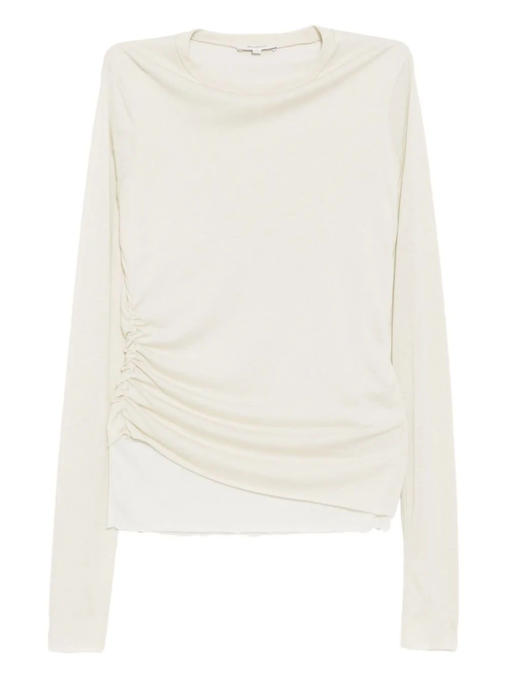 layered T-shirt Highlights - Ivory - Crew neck - Long sleeves - Ruched detailing Imported Composition Rayon 67%, Cotton 33% SIZE & FIT Model measurements Height 5 ft 9 in(1.76 m) Bust/Chest 32.28 in(82 cm) Hips 35.82 in(91 cm) Waist 25.59 in(65 cm) FittingInformation Designed for a slim fit that sits just away from the body offering a close yet comfortable fit Made from a midweight non-stretch fabric, this piece offers minimal elasticity when worn Washing instructions Machine Wash