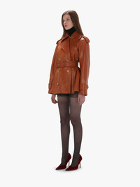 - Short trench jacket - Storm flap - Low pockets to hem - Self belt - Horn buttons - Silver hardware - Half lined - Fits true to size - take your usual size Additional Information - Colour: Tan - Composition - Main: 100% Calf leather - Lining: 100% Cotton - Smooth leather - Semi shine finish - Made in Romania