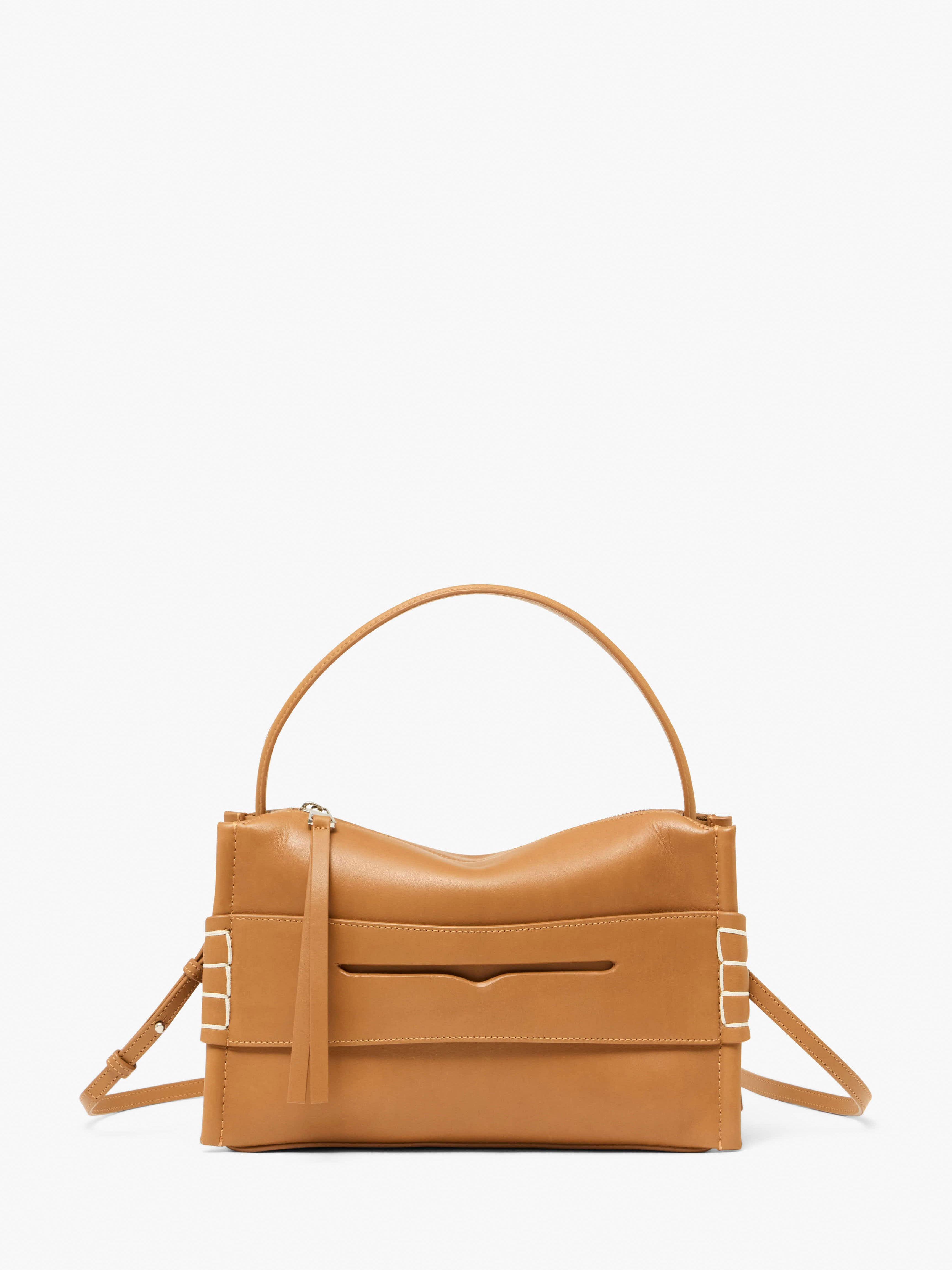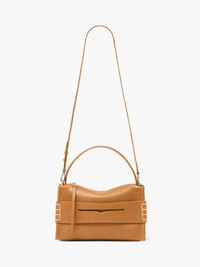 - Top handle bag with loafer inspired front panel complete with white topstitching - Detachable leather strap - Blind logo embossing on back panel - Top zip opening with branded puller - Inner leather pocket with blind logo embossing Additional Information - Colour: Tan - Dimensions: H: 20.5cm / W: 28.5cm / D: 10cm - Strap Drop: Adjustable: 46cm, 47cm, 48cm - Top Handle Drop: 13cm - Strap Length: 105cm - Outer: 100% Full grain calf leather - Lining: 100% Split grain calf leather - Hardware: 100% Zamak - Made in Italy