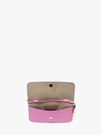 - Phone pouch with adjustable leather strap - Three gold-tone chain link detailing - Front flap opening with embossed logo - Gold-tone hardware