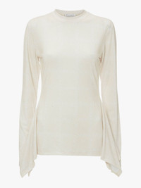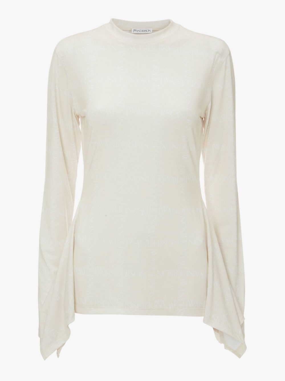 • Crew neckline long sleeve top • Fitted silhouette • Asymmetric hem • Printed logo grid artwork