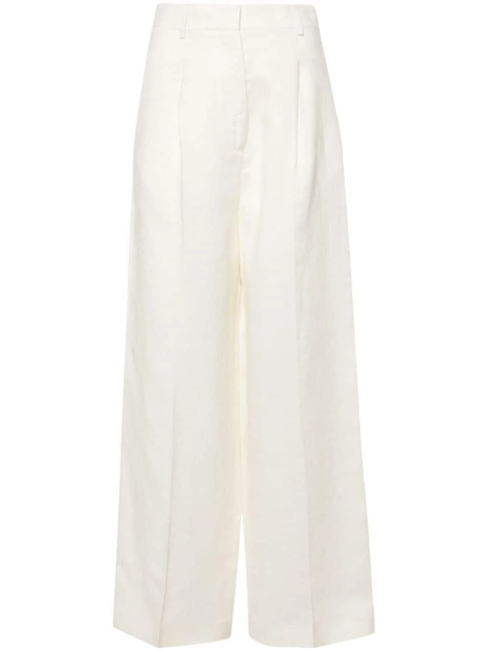 logo-stripe palazzo pants Highlights - Cream white - Cotton-linen blend - Logo-jacquard stripe detailing - Folded panel detail - Pleat detailing - Wide leg - High-waisted - Concealed front button, hook and zip fastening - Belt loops - Side slit pocket - Two rear welt pockets - Pressed crease - Unlined Made in Italy Composition Outer: Cotton 51%, Linen/Flax 49% Lining: Cotton 100% Washing instructions Dry Clean Only