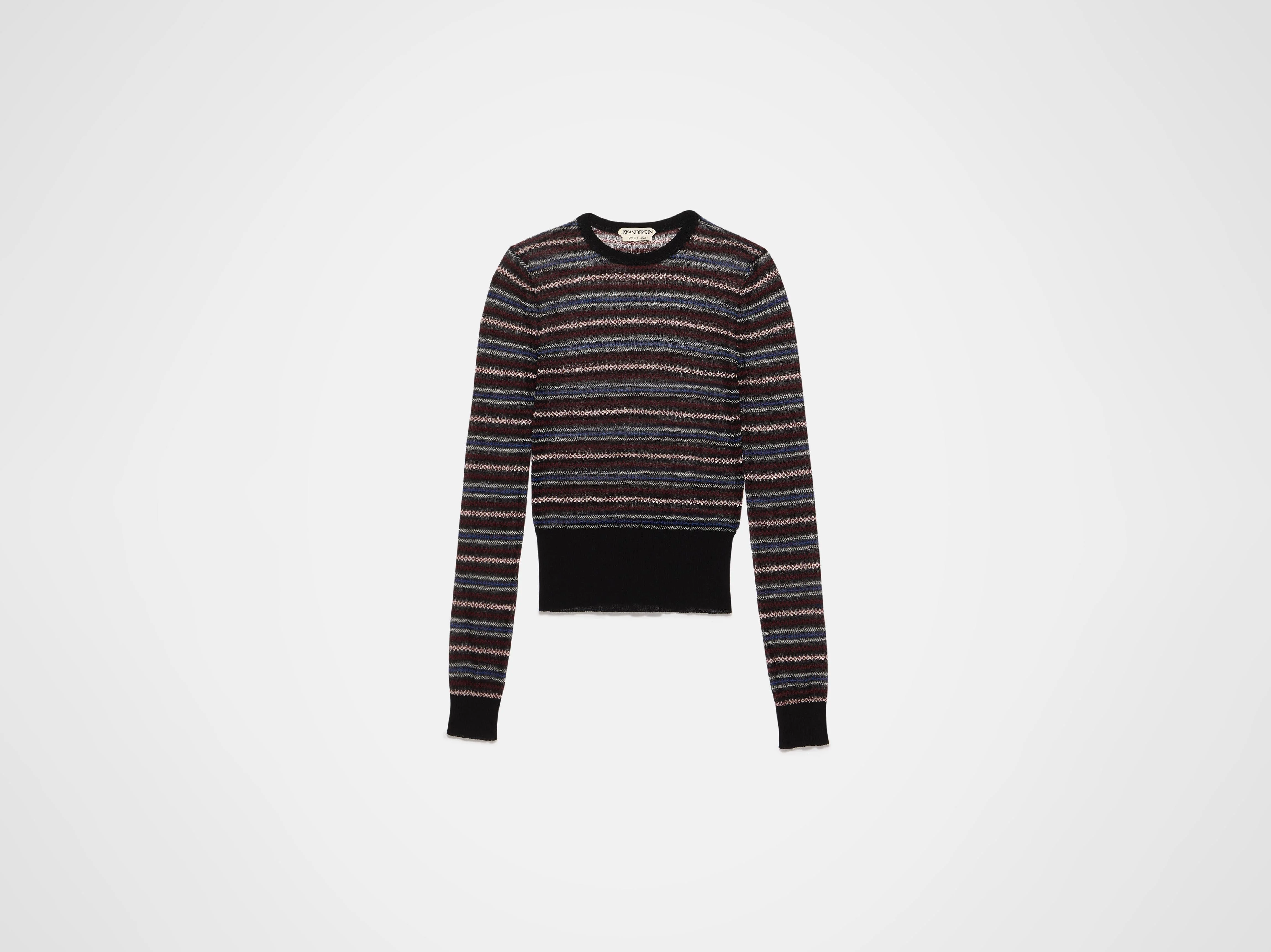 Long sleeve crew neckline underpinning top in black. Features a fairisle knit in a light, semi-sheer weight knit. Details - Colour: Black - Composition [Main]: 64% Cotton, 18% Wool, 18% Polyamide - Made in: Italy - Model [Wears]: Size XS, 180cm Tall - SKU: KW1473YN0460999