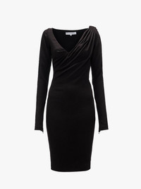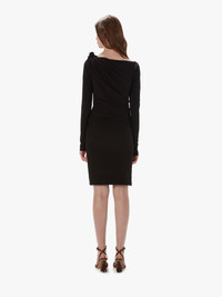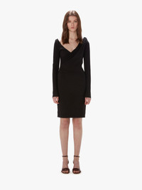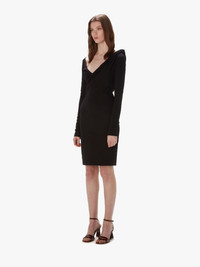 - Long sleeve dress featuring draped V neckline - Pleated shoulder detail - Invisible cuff - Invisible side zip closure - Unlined - Fitted silhouette - take your usual size