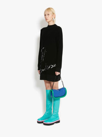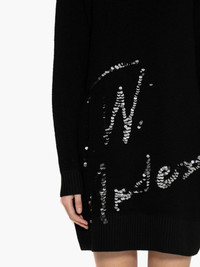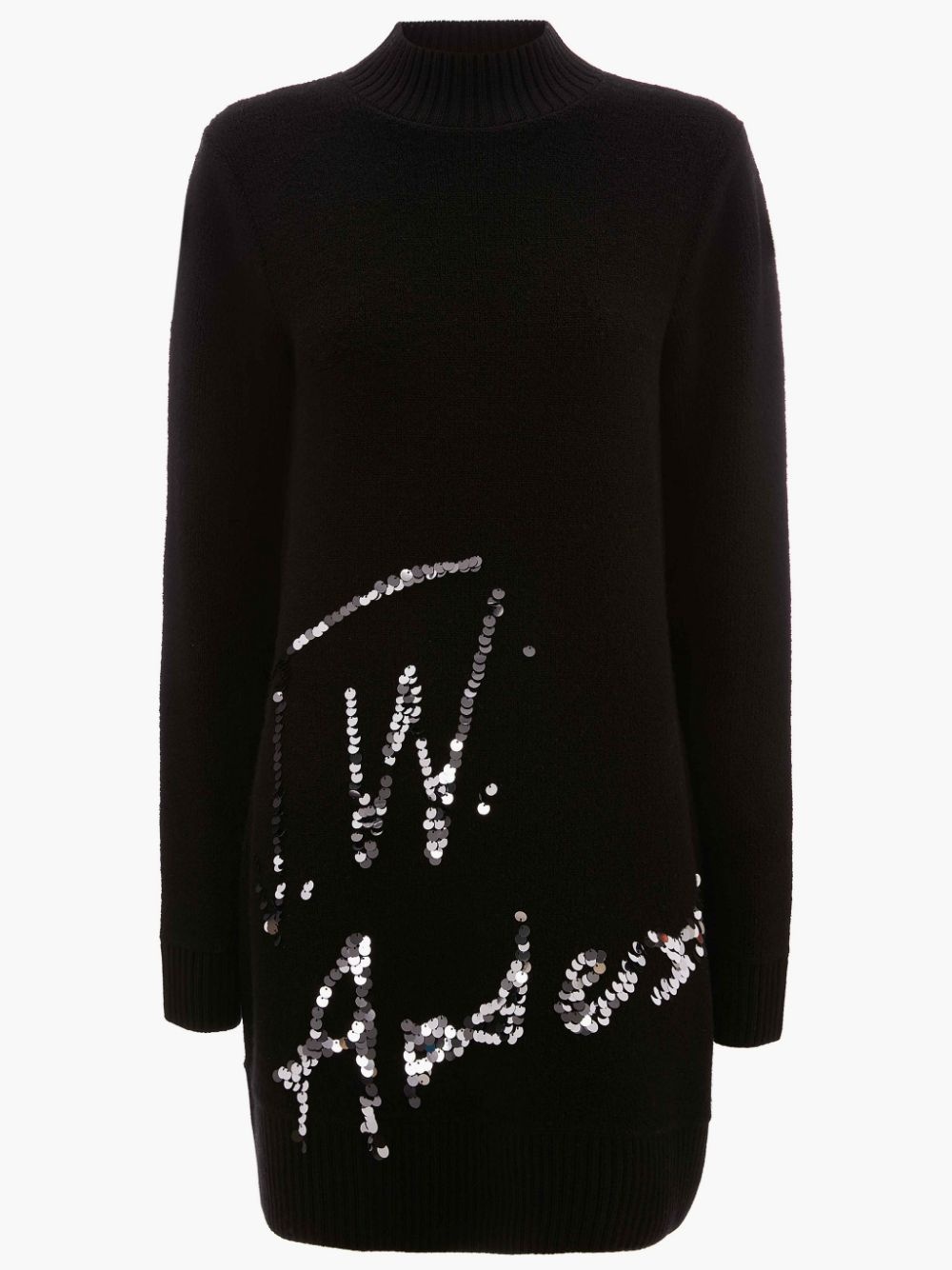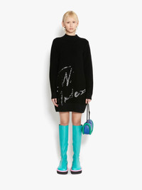 - Relaxed fit mini dress - Mock necklne - Ribbed hems - Machine knitted JW Anderson sequins logo - Towelling texture - Fits true to size, take your normal size. Details - Colour: Black - Composition: 100% Merino Wool - Plush stitch + sequin embroidery - Mid weight - Yarn from China