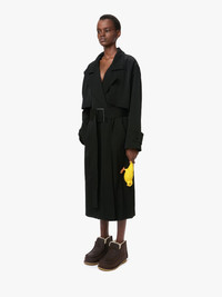 - Double breasted layer detailing - Wide lapels - Tonal button fastening - Frontal belt tie with metal belt buckle - Frontal side pockets - Fully lined - Relaxed fit, take your usual size Additional Information - Colour: Black - Composition - Main: 100% Virgin Wool - Lining: 100% Polyester - Mid-weight wool gabardine fabrication - Made in Italy - SKU: CO0310PG0011999