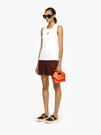 - Twisted bow short top handle bag with detachable crossbody silver chain - Blind logo embossing on front flap - Magnetic flap opening - Inner pocket with silver logo embossing - Nappa lining - Can be worn as a clutch, on the shoulder or as a crossbody Additional Information - Colour: Orange - Dimensions H: 13cm / W: 21cm / D: 8cm - Strap Drop: Long: 56cm / M: 23cm / Short: 3cm - Outer: 100% Full grain lamb leather - Lining: 100% Lamb leather - Hardware: 90% Brass, 10% zamak - Made in Spain