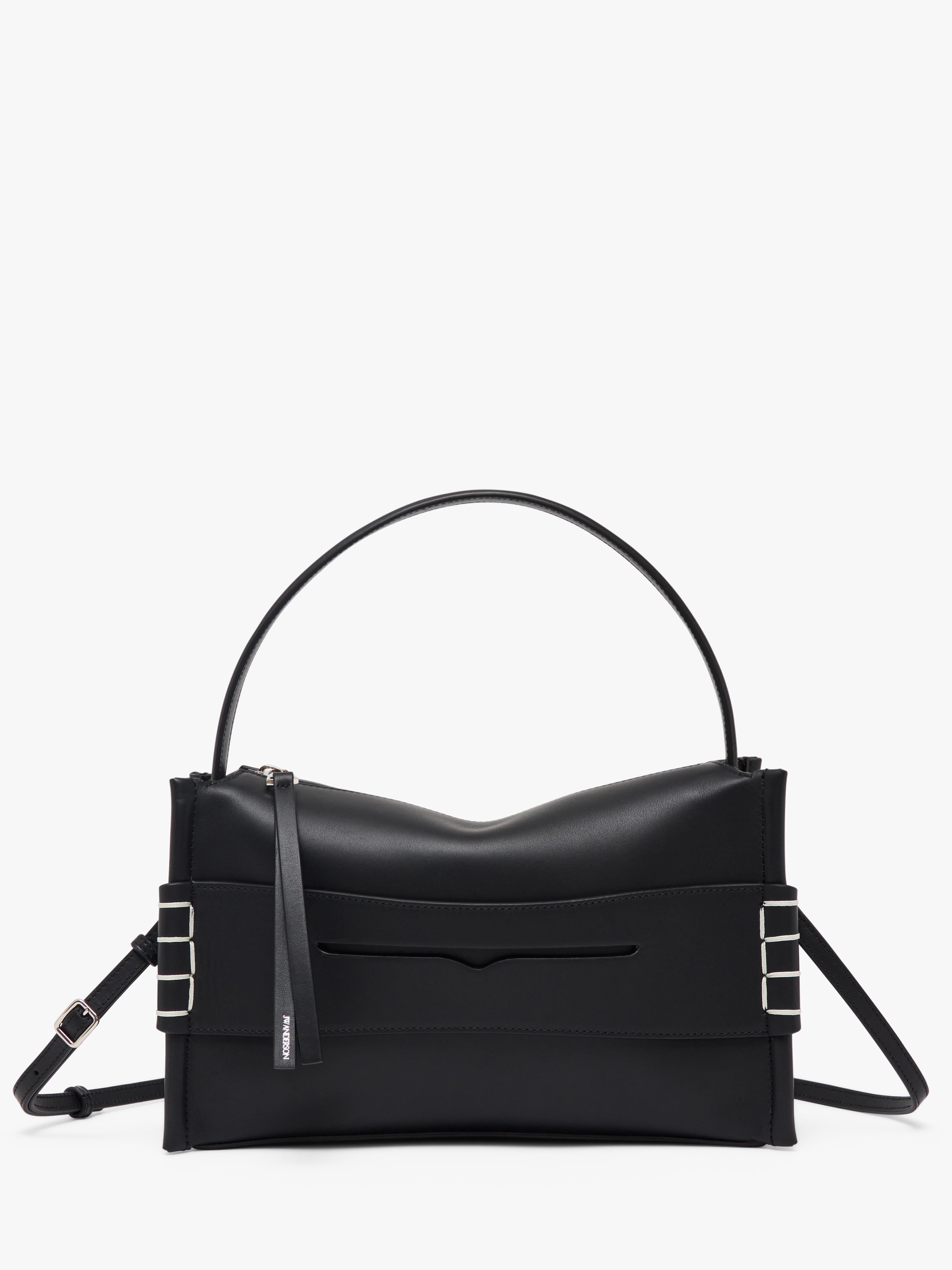 - Leather top-handle bag with with loafer inspired front panel and white topstitching - Detachable leather crossbody strap - Blind logo embossing on back panel - Top zip opening with branded puller - Silver hardware - Inner leather pocket with blind logo embossing - Suede lining - Can be worn crossbody or in hand Details - Colour: Black - Dimensions: H: 23.5cm / W: 34cm / D: 13cm - Strap Drop: Adjustable: 46cm, 47cm, 48cm - Top Handle Drop: 15cm - Strap Length: 105cm - Outer: 100% Full grain calf leather - Lining: 100% Split grain calf suede - Hardware: 100% Zamak - Made in Italy - SKU: HB0732LA0360999
