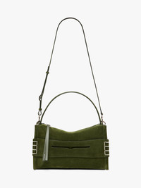 - Leather top-handle bag with with loafer inspired front panel and white topstitching - Detachable leather and suede crossbody strap - Blind logo embossing on back panel - Top zip opening with branded puller - Silver hardware - Inner leather pocket with blind logo embossing - Suede lining - Can be worn crossbody or in hand Details - Colour: Khaki - Dimensions: H: 23.5cm / W: 34cm / D: 13cm - Strap Drop: Adjustable: 46cm, 47cm, 48cm - Top Handle Drop: 15cm - Strap Length: 105cm - Outer: 80% Split grain calf leather, 20% Full grain calf leather - Lining: 100% Split calf leather - Hardware: 100% Zamak - Made in Italy - SKU: HB0732LA0364575