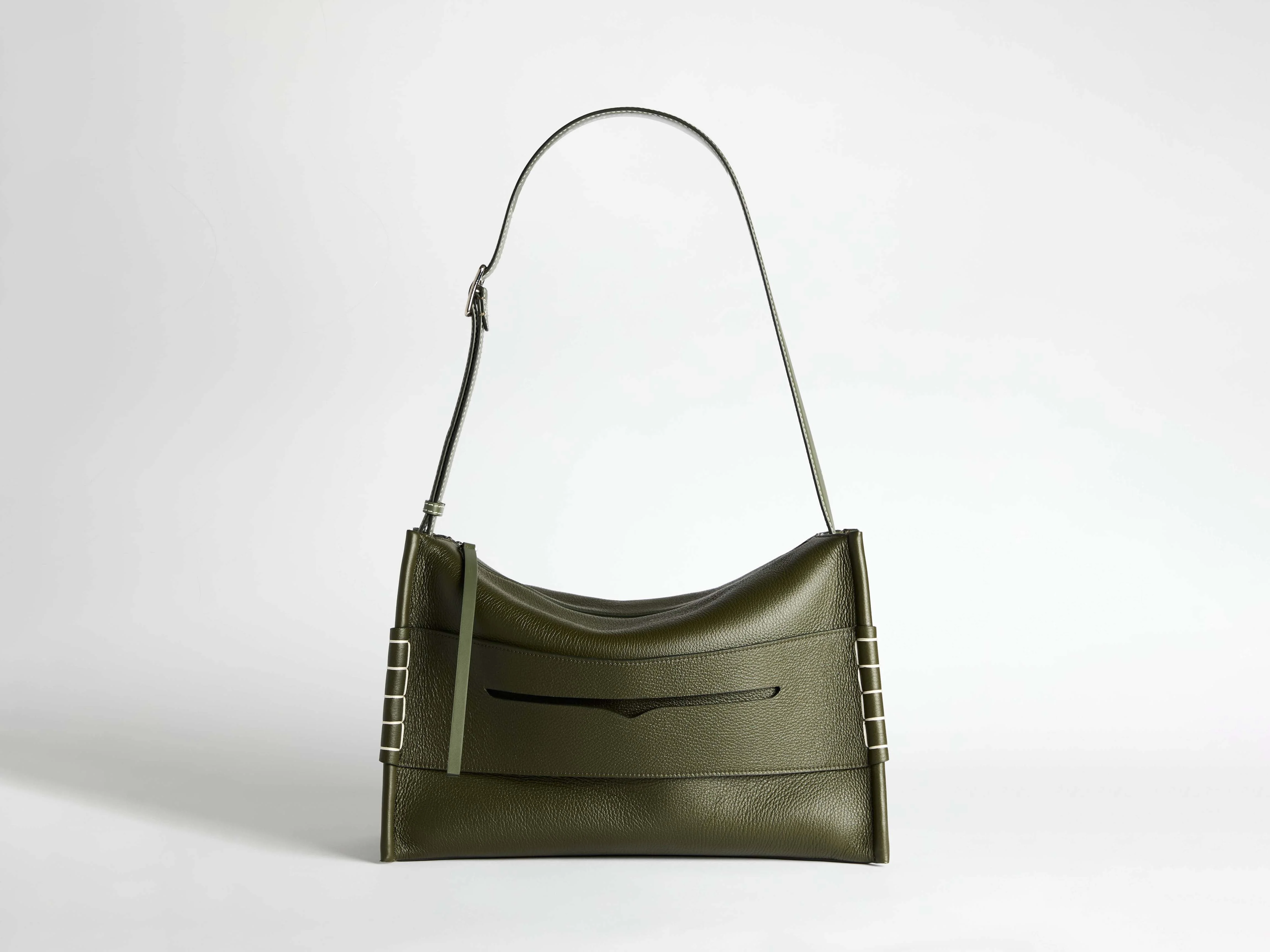 Crafted in Italy. The Messenger Loafer Bag in khaki green calf suede and smooth calf leather. Made for movement, in a compact size, with an adjustable cross body strap and wider opening for easy of functionality. Finished with silver finish hardware. Every detail is carefully considered. The penny keeper, sewn by hand with box stitches, wrapping over four times, reminiscent of the shoe itself. The base mimics the sole of a loafer, stitching details reflect the welt of a shoe. Precisely cut, edge-painted and logo embossed leather is meticulously assembled, for a seamless fit. Functional, fluid, made to move. Details - Colour: Khaki - Composition [Main]: 80% Full Grain Deer Leather, 20% Full Grain Calf Leather - Composition [Lining]: 100% Split Grain Calf Leather - Composition [Hardware]: 100% Zamak - Measurements: [H] 27cm | [L] 41cm | [W] 18cm - Made in: Italy - SKU: HB0749LA0377575