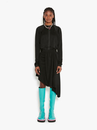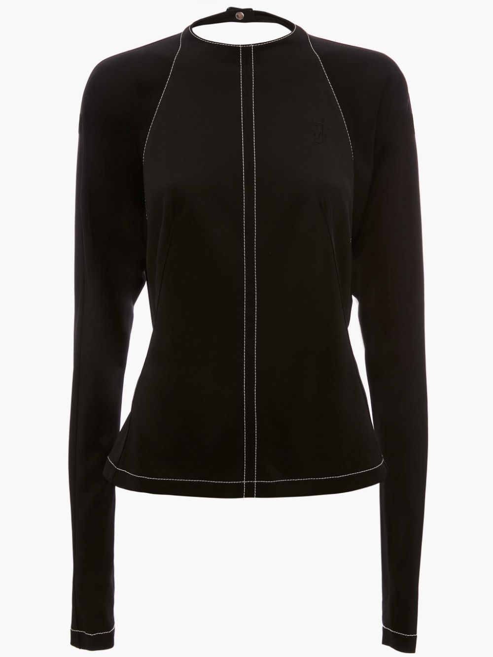 - Long sleeve top - Crew neckline and raglan sleeve - Open back with snap closure at neck - Contrast front panel - Contrast top stitching - Tonal anchor embroidery on chest - Silver hardware - Fits true to size, take your normal size. Details - Colour: Black - Composition: 100% Viscose - Shiny finish - Opaque quality - Contemporary take on sports - Fabric from Italy